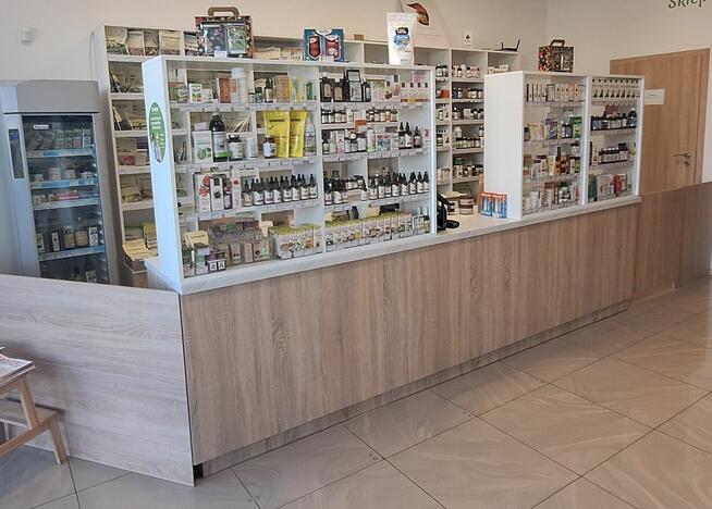 Sprzedam komplet mebli sklepowych białych z frontami w kolorze bielonego dębu: Lada sprzedażowa szer 350cm wys 90cm ...